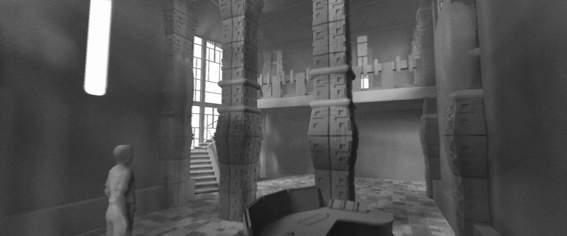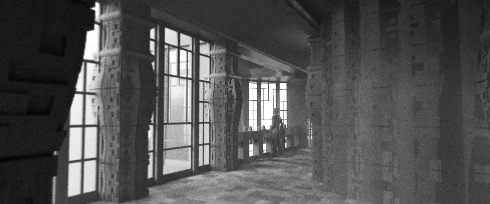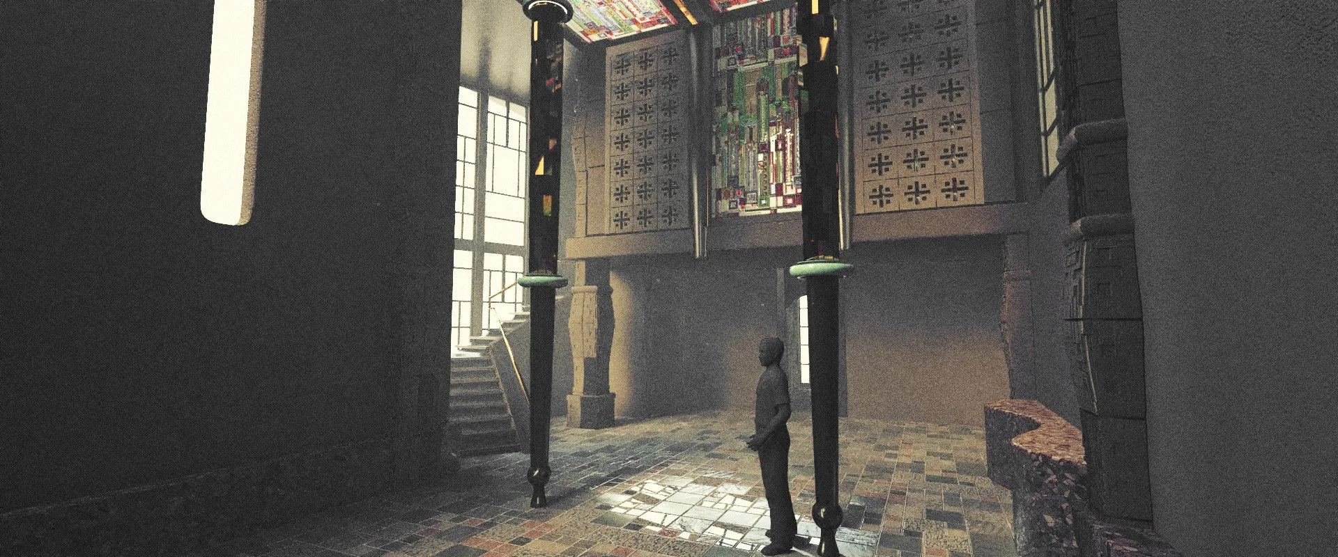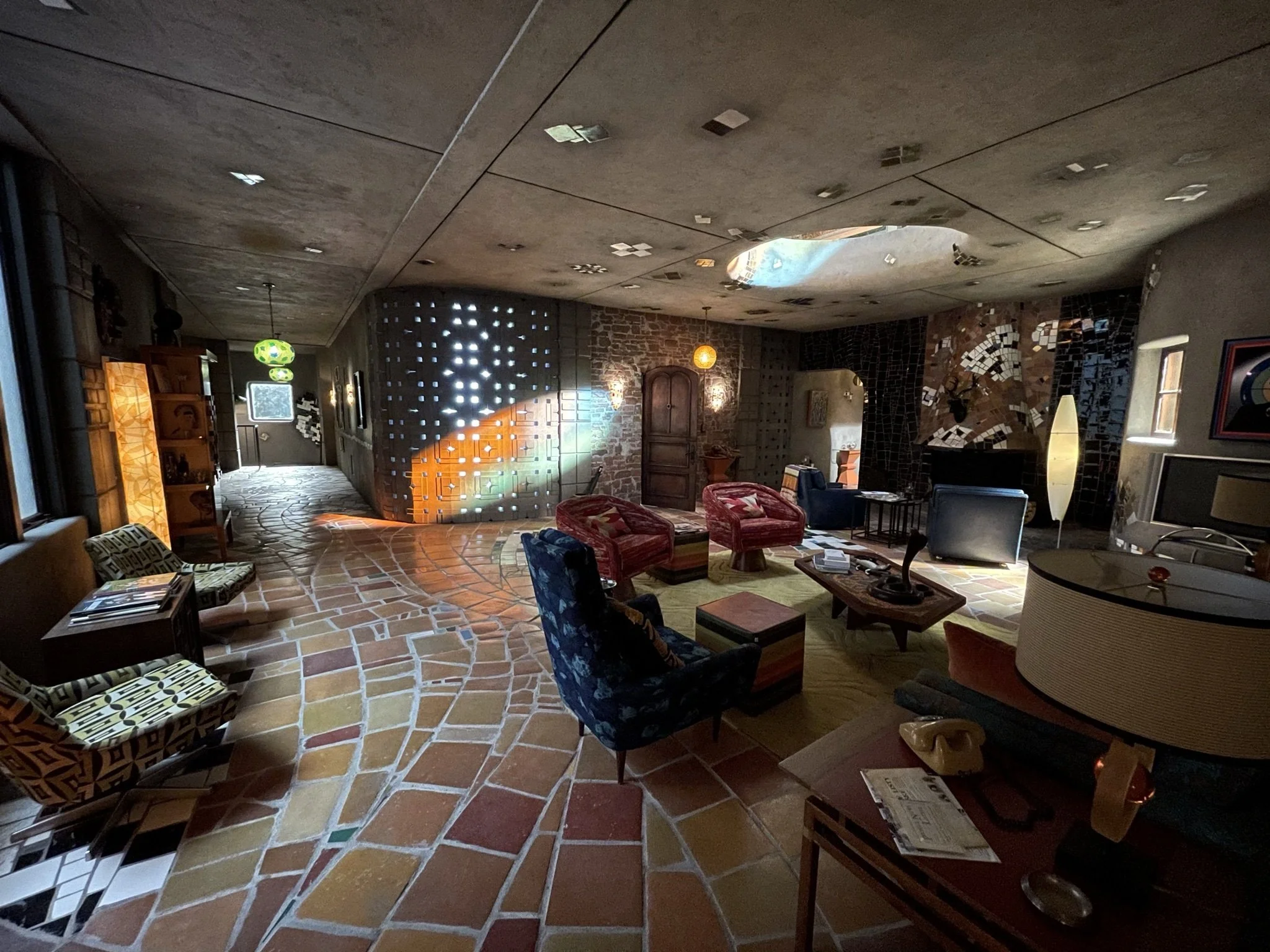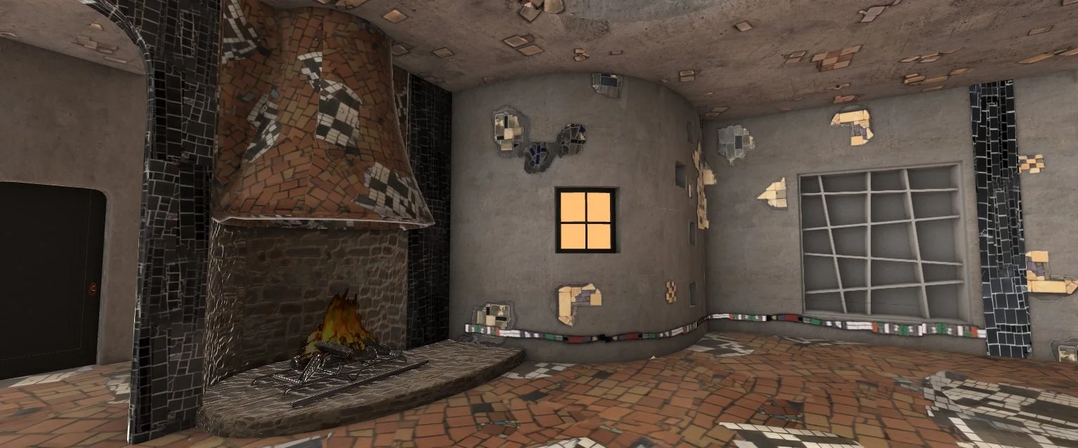 When we started laying in elements from Hundertwasserhaus, we found that everything worked better when it was more sculptural. We could take the FLW conceptions of space and add in curved and sculptural elements and they would hang together. The curved walls and round fireplace would serve as the tie between the storer house elements and things like the mosaic tile floor. We slowly worked the details so they felt more like Hundertwasserhaus while maintaining that underlying layer of the Storer house to give us our foreboding atmosphere.