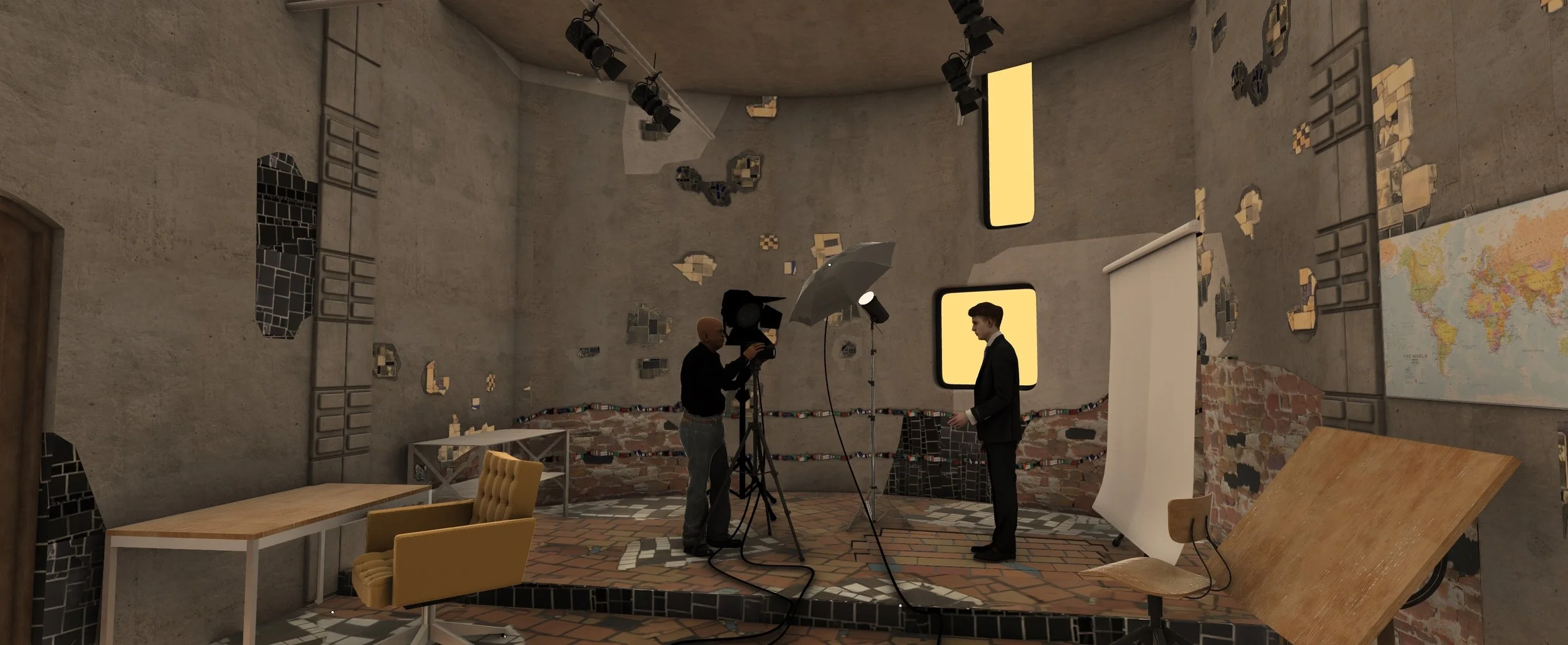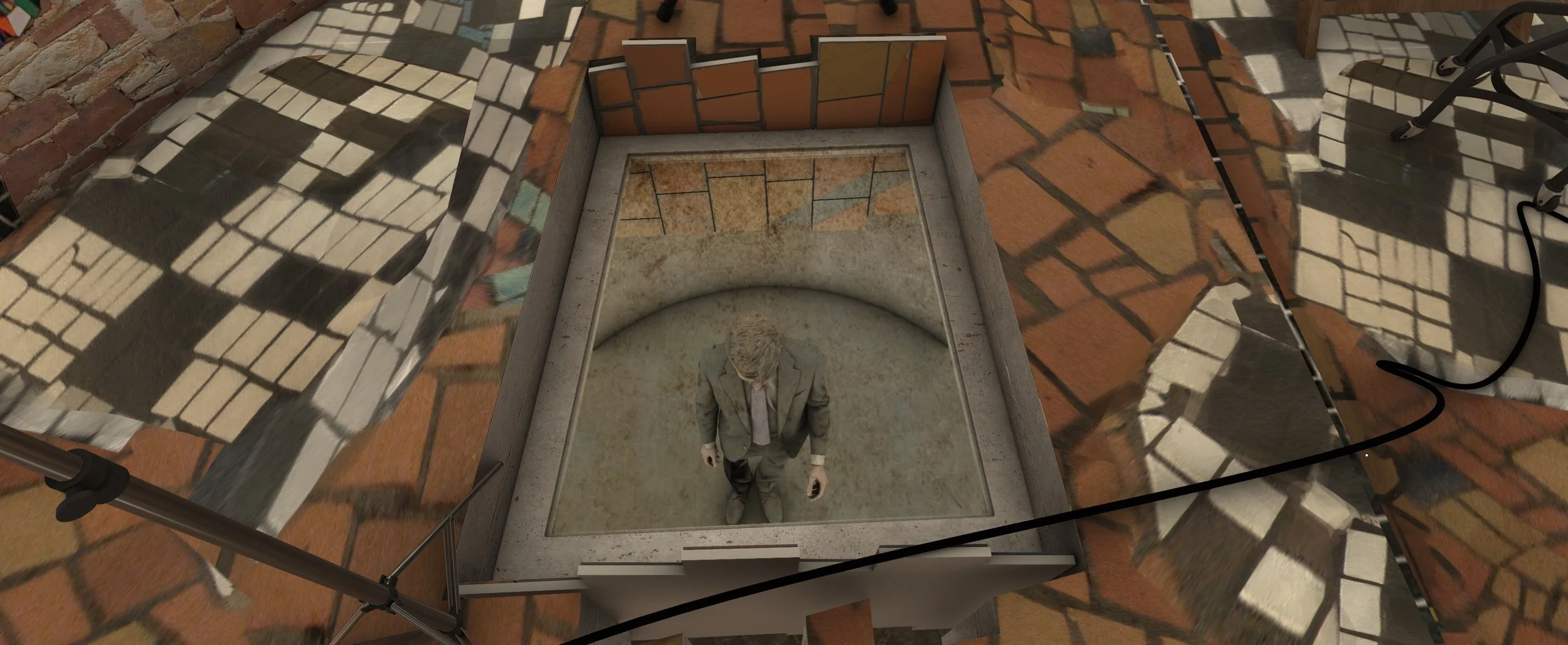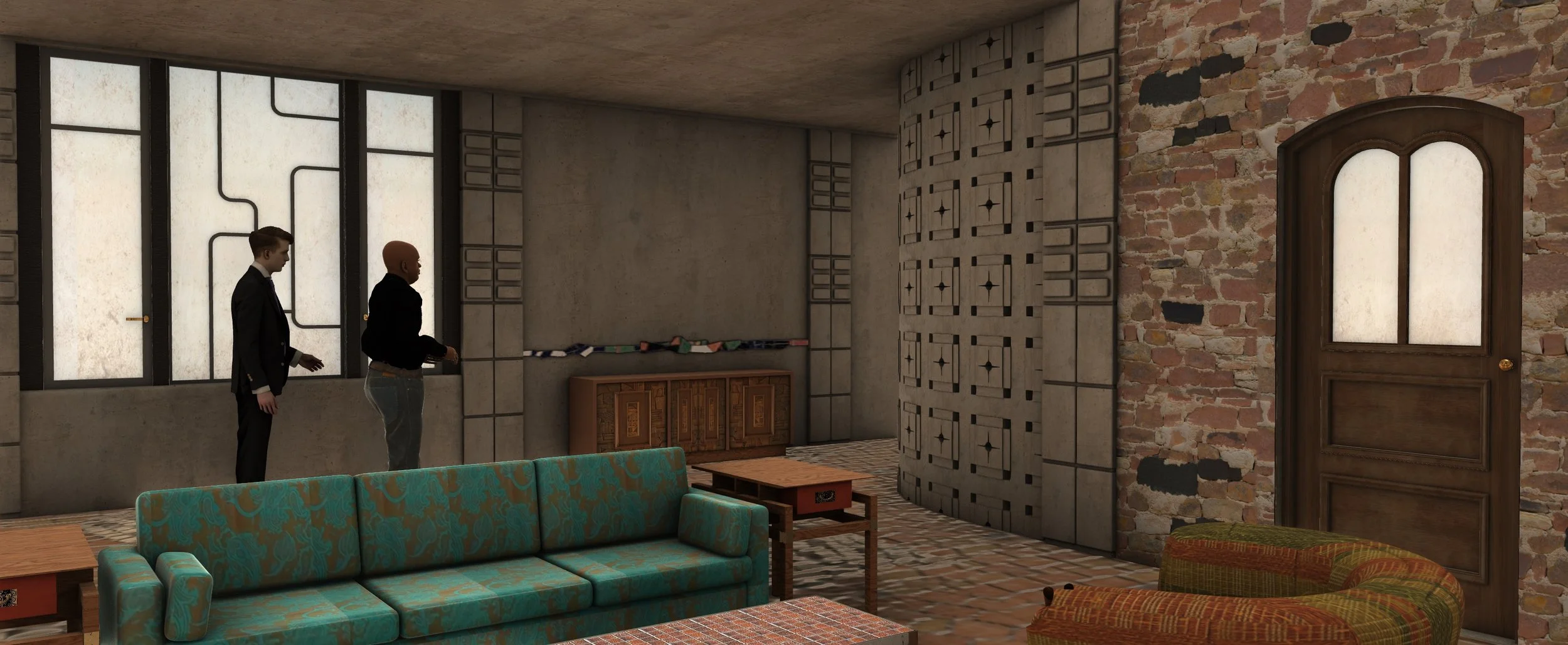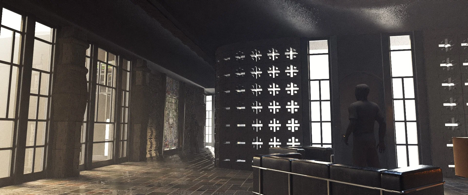 When we started laying in elements from Hundertwasserhaus, we found that everything worked better when it was more sculptural. We could take the FLW conceptions of space and add in curved and sculptural elements and they would hang together. The curved walls and round fireplace would serve as the tie between the storer house elements and things like the mosaic tile floor. We slowly worked the details so they felt more like Hundertwasserhaus while maintaining that underlying layer of the Storer house to give us our foreboding atmosphere.