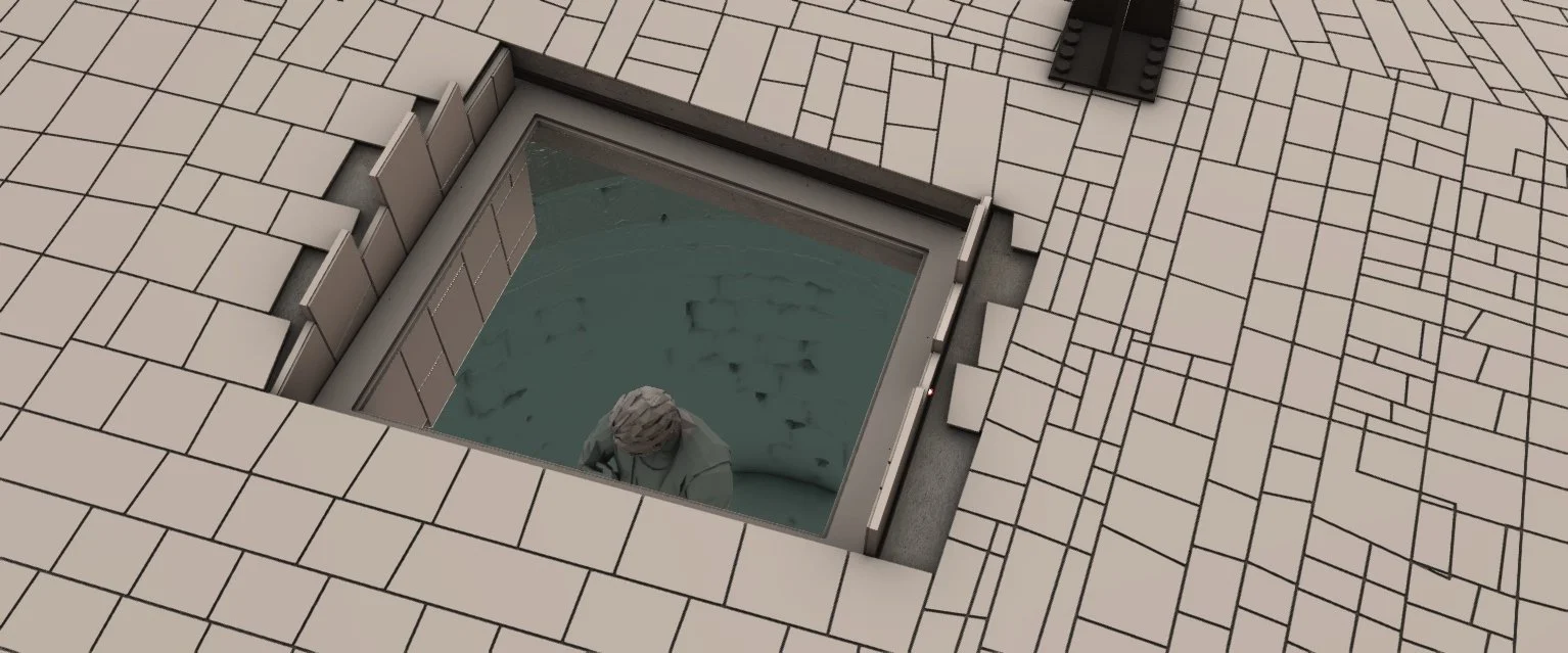 At the same time, we had to figure out a way for the trap door gag to work. How could we hide a trap door and still make it impossible for our very capable hero to get out of. The solution ended up being a double door: a trap door that he would fall through and a containment door that could slide in just under it.